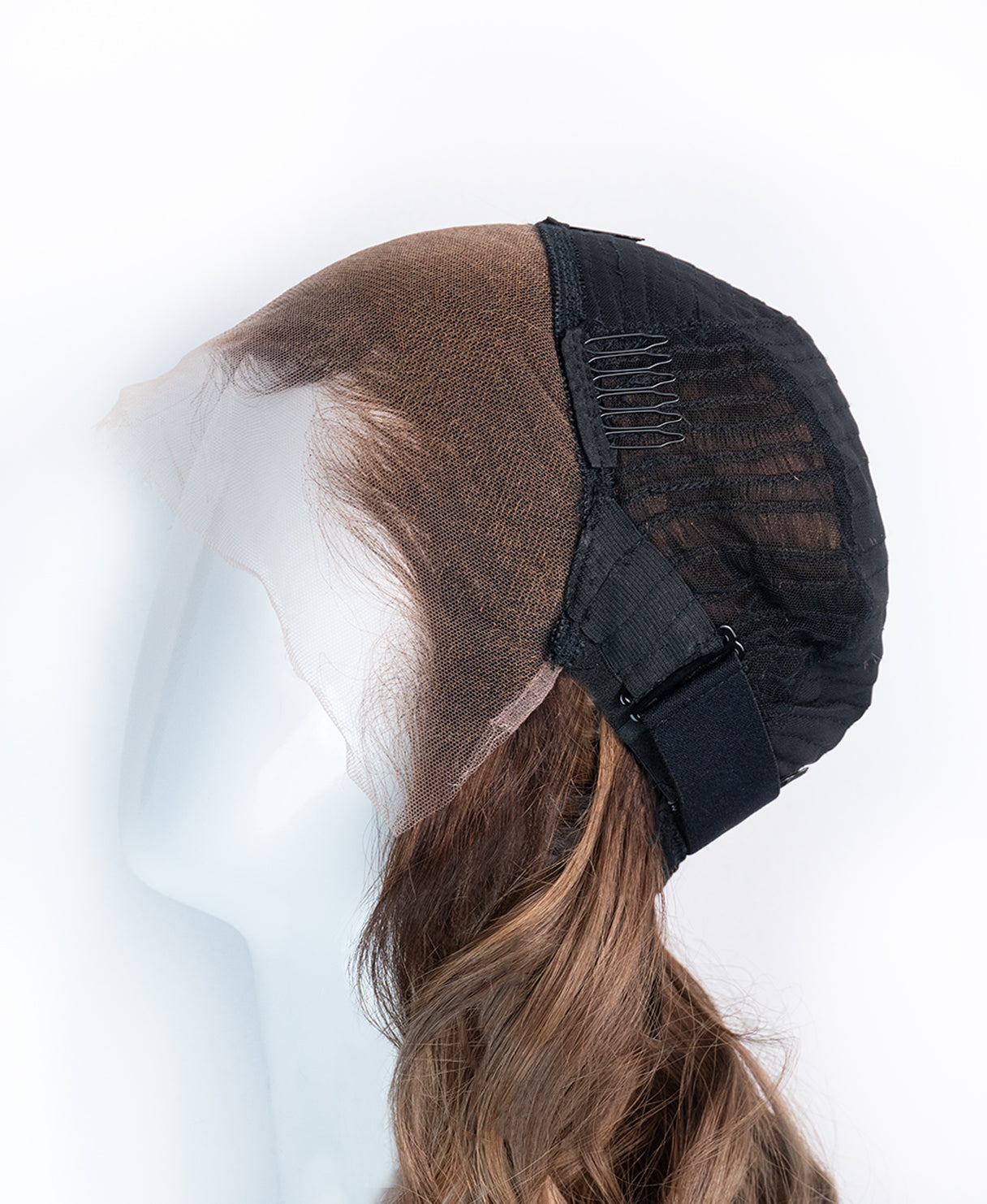 Full lace wigs are manufactured with a base that is made of lace. Individual hairs are then sewn into the lace. The first time you use the wig you need to trim and easily customize the lace to your desired hairline.
