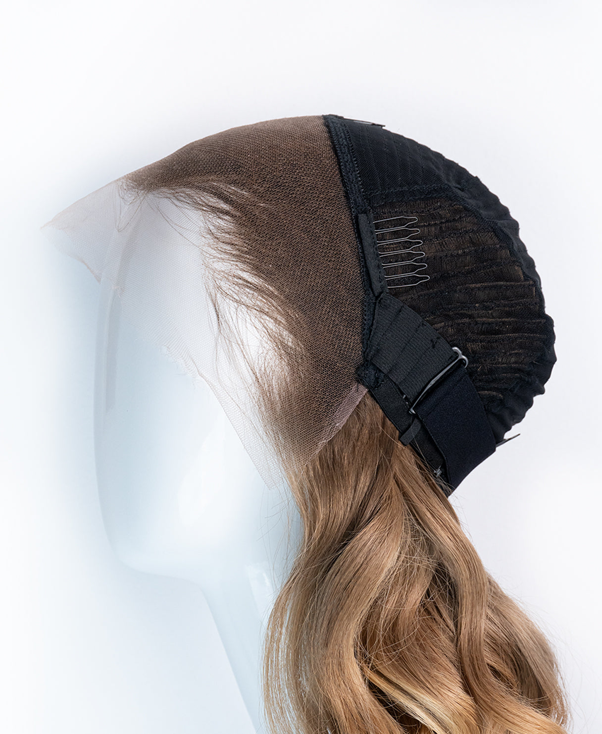 Full lace wigs are manufactured with a base that is made of lace. Individual hairs are then sewn into the lace. The first time you use the wig you need to trim and easily customize the lace to your desired hairline.