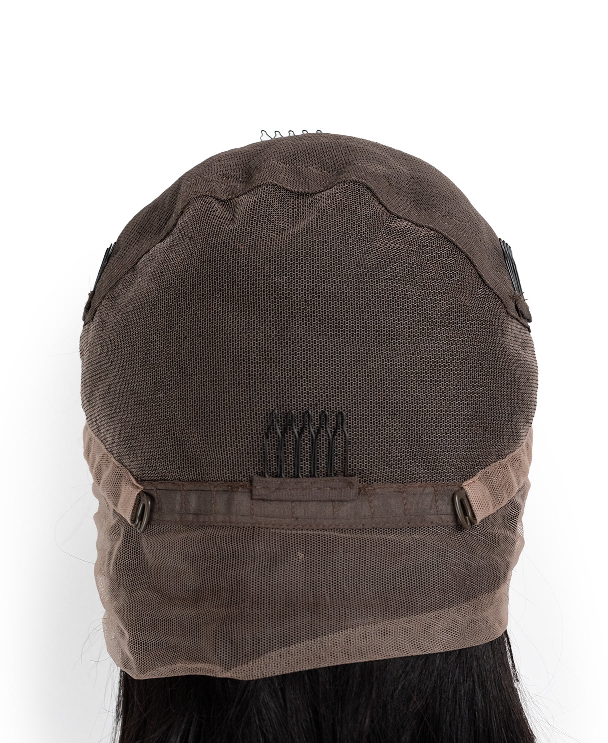 Full lace wigs are manufactured with a base that is made of lace. Individual hairs are then sewn into the lace. The first time you use the wig you need to trim and easily customize the lace to your desired hairline.