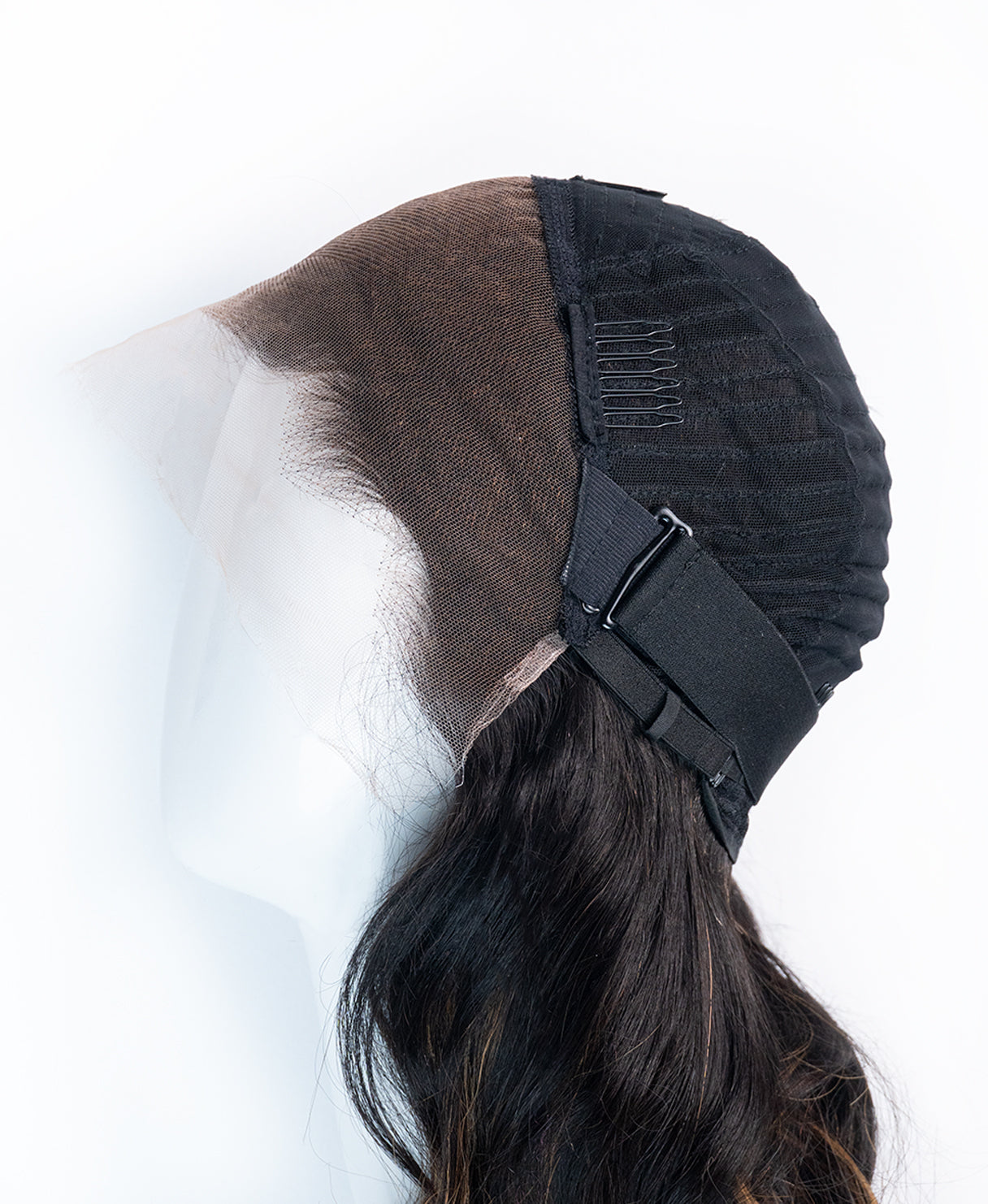 Full lace wigs are manufactured with a base that is made of lace. Individual hairs are then sewn into the lace. The first time you use the wig you need to trim and easily customize the lace to your desired hairline.