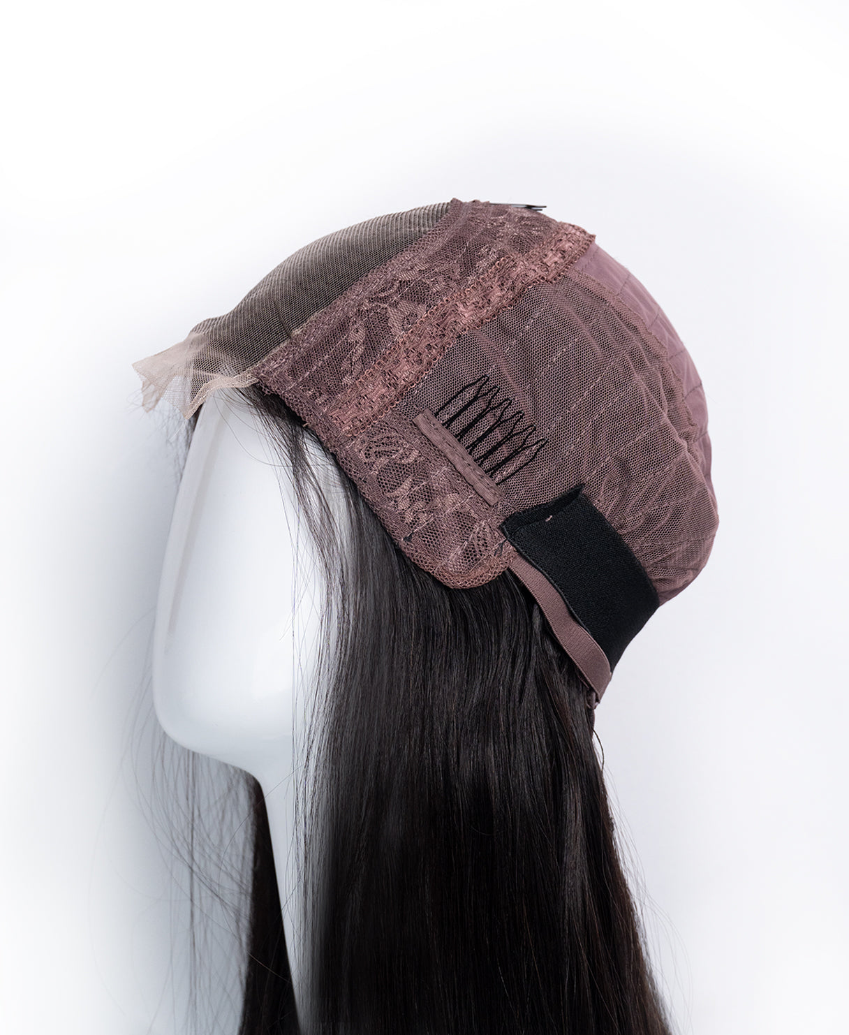 Full lace wigs are manufactured with a base that is made of lace. Individual hairs are then sewn into the lace. The first time you use the wig you need to trim and easily customize the lace to your desired hairline.